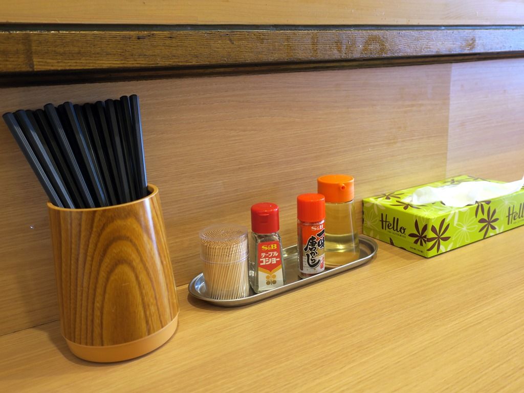 BGMはラジオ放送。箸は洗い箸でエコ仕様。卓上調味料はS&Bコショー・一味唐辛子、酢。
