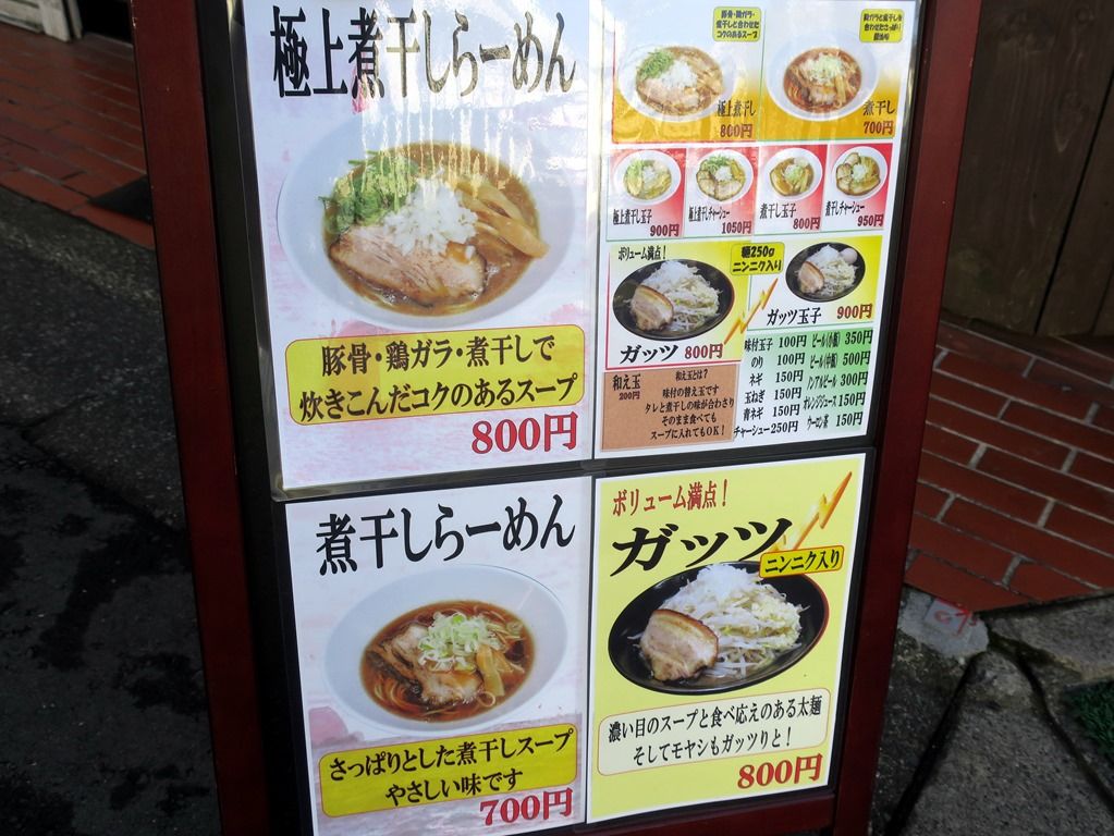 メニュー説明によると、「極上煮干しラーメン:豚骨・鶏ガラ・煮干しと合わせたコクのあるスープ、煮干しらーめん:鶏ガラと煮干しを合わせたさっぱり醤油味、ガッツ・・・濃い目のスープと食べ応えのある太麺。麺250g ニンニク入り」。