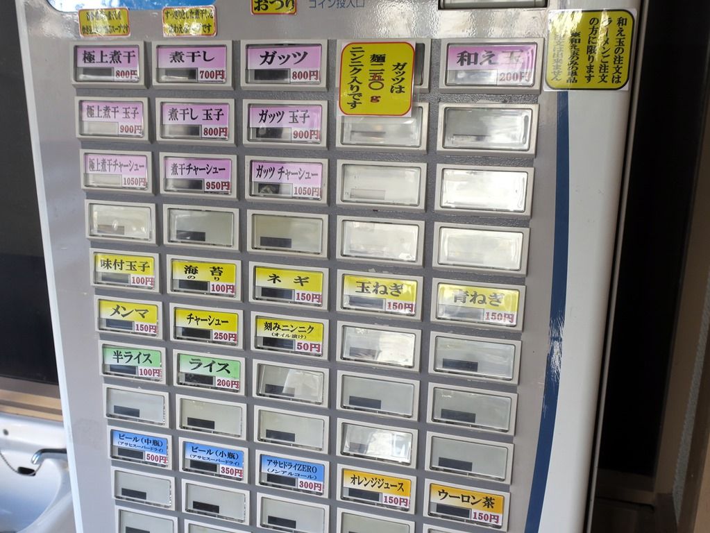 定刻にオープン。入店すると、まず券売機で食券購入です。主なメニューは、極上煮干しらーめん800円、煮干しらーめん700円、ガッツ800円、和え玉200円、他。