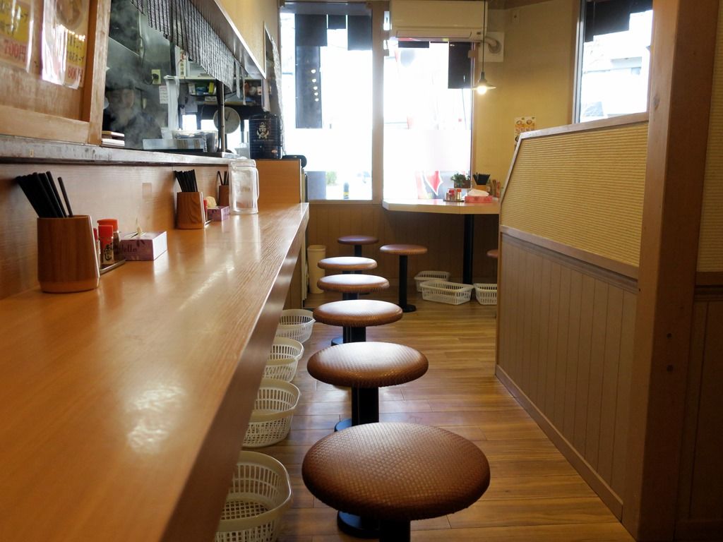 店内は厨房前に真っ直ぐなカウンター7席、窓に向かった半円形カウンター4席、4人卓x1。後客2。スタッフは男性2、女性1の3名。