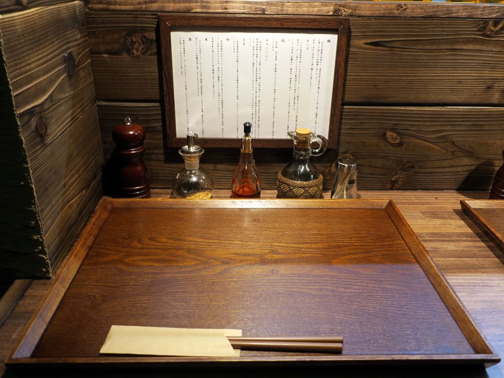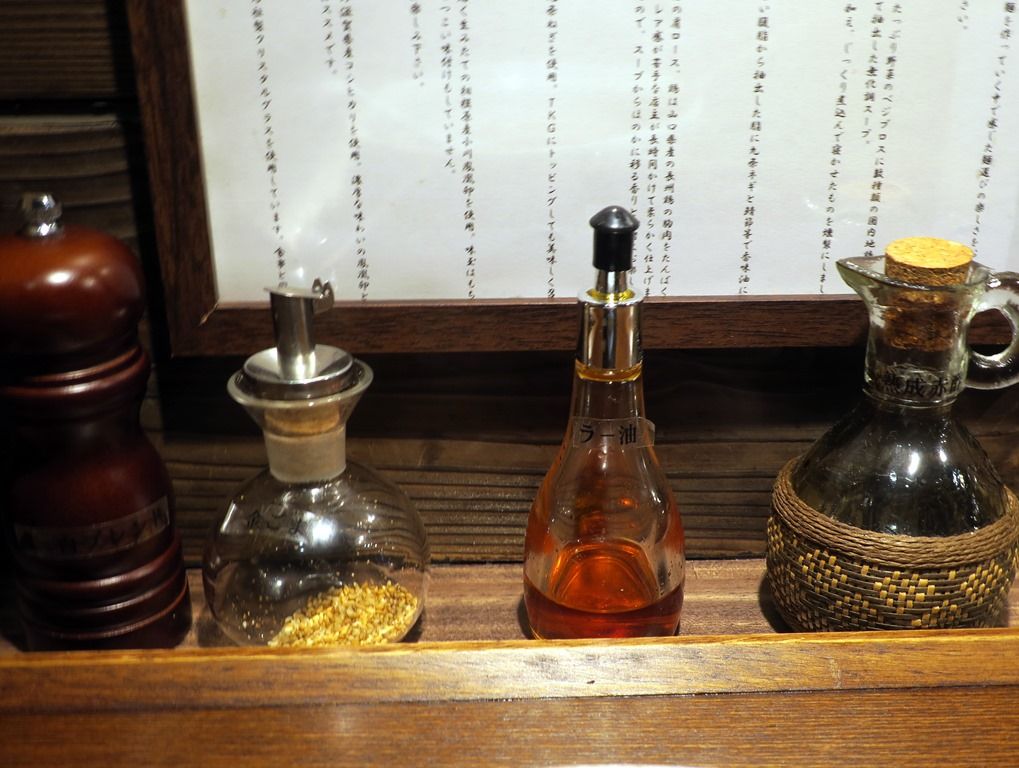 BGMはJ-Pop。箸は洗い箸でエコ仕様。卓上調味料は、ミル入りミックスペッパー。金胡麻、ラー油、熟成赤酢。
