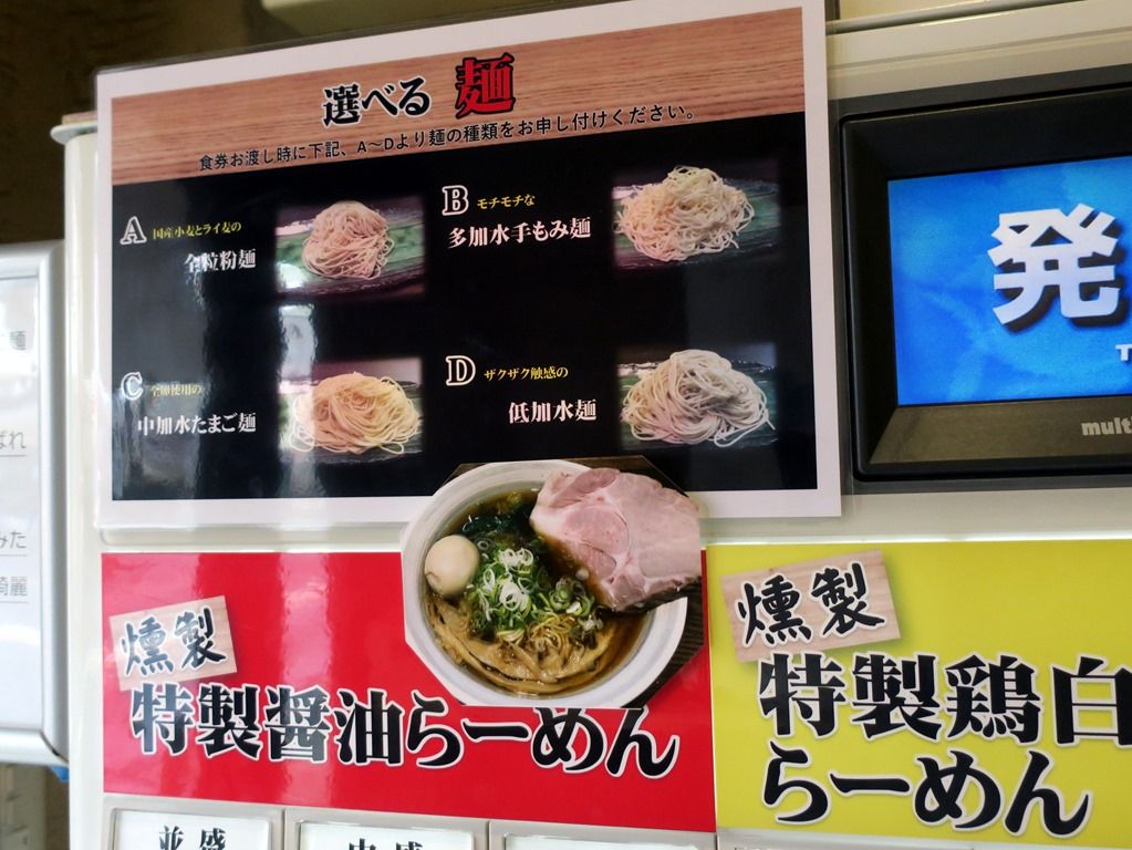 食券を渡すと、麺を4種類から選ぶように言われます。選べる麺は、A.国産小麦とライ麦の全粒粉麺 B.モチモチな多加水手もみ麺 C.全卵使用の中加水たまご麺 D.ザクザク食感の低加水麺。目安として、A・Dが細麺、B・Cがやや太めとのこと。