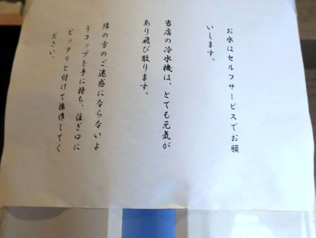 お冷は券売機反対側の給水器からセルフで。とても元気の良い給水器で水が飛び散るそうです。私の時は大丈夫でした。