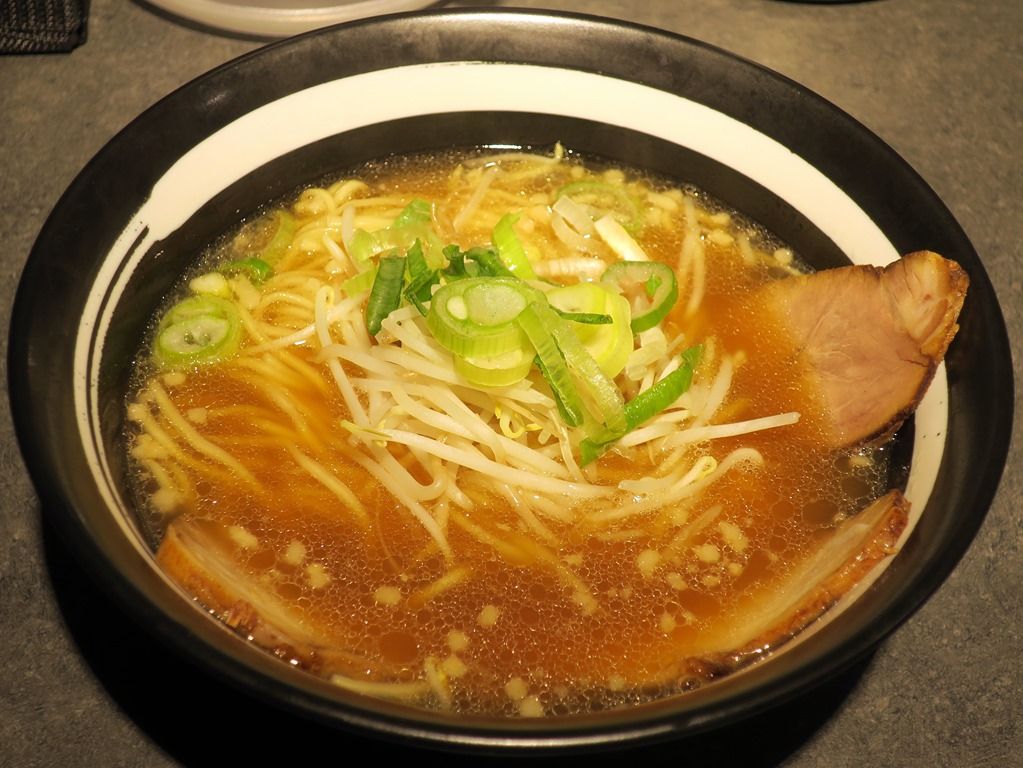 具はチャーシュー、もやし、小口切り九条ねぎ、きざみ白ねぎ。丼からはみ出すチャーシューはとろっとろ。濃い緑の九条ねぎが風味・味共に鮮烈。