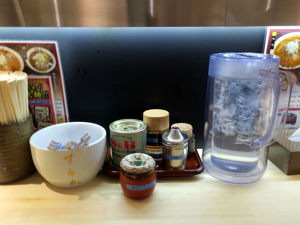 BGMは最新ヒットJ-POP、Lemon、マリーゴールド、アイノカタチとか♪YouTubeかな?箸は割り箸。卓上調味料は柚子胡椒、一味唐辛子、酢、S&Bコショー缶。