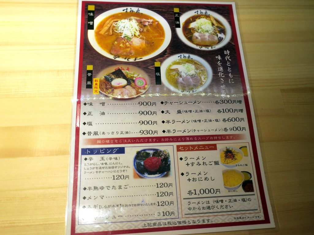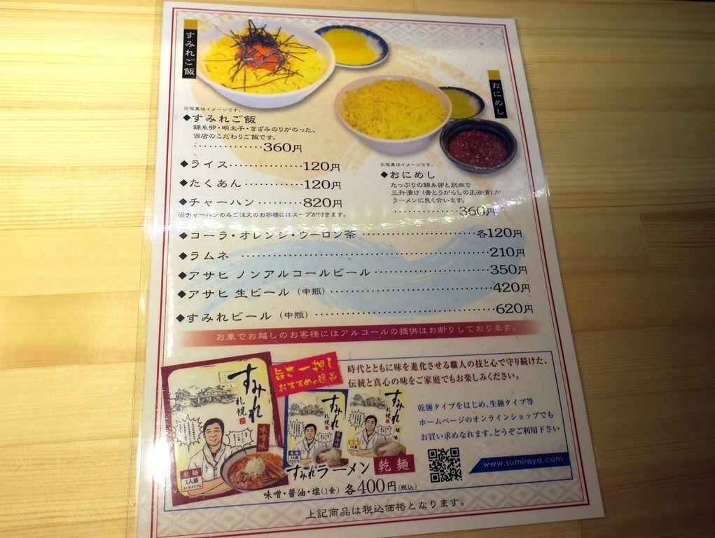 ラーメン+すみれご飯・ラーメン+おに飯 各1000円、村中社長のラーメン980円、季節のラーメン950円、他。