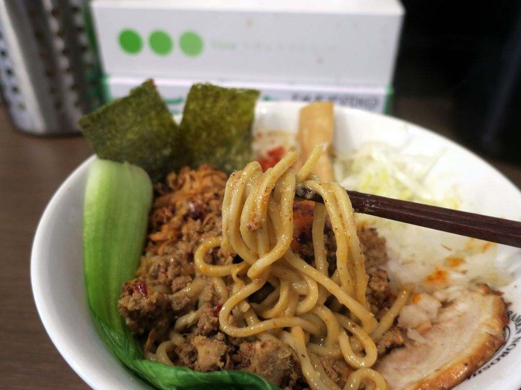 麺はストレートの太麺。丼の底にゴマペーストとラー油・花椒の濃厚な担々ソースがたっぷりと。全体をグルングルンとかき混ぜていただくと、胡麻の濃厚な味わいに肉そぼろの旨味と麻辣のアクセント。痺れ辛味増し可能は後から気づいたのですが、辛い物好きなら是非マシ推奨。東大宮店で一躍人気メニューに躍り出ただけあってさすがの完成度。ハマる系の味わいで満足度高くすごく美味しい!