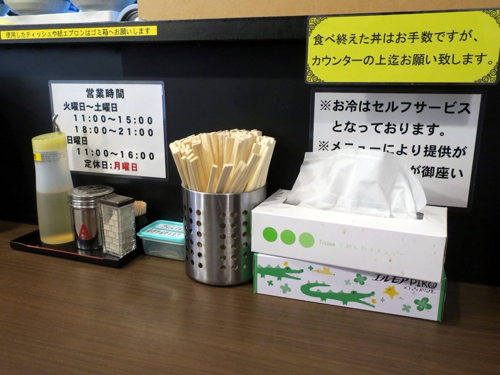 BGMはJ-Pop。箸は割り箸。卓上調味料は酢、一味唐辛子、胡椒。