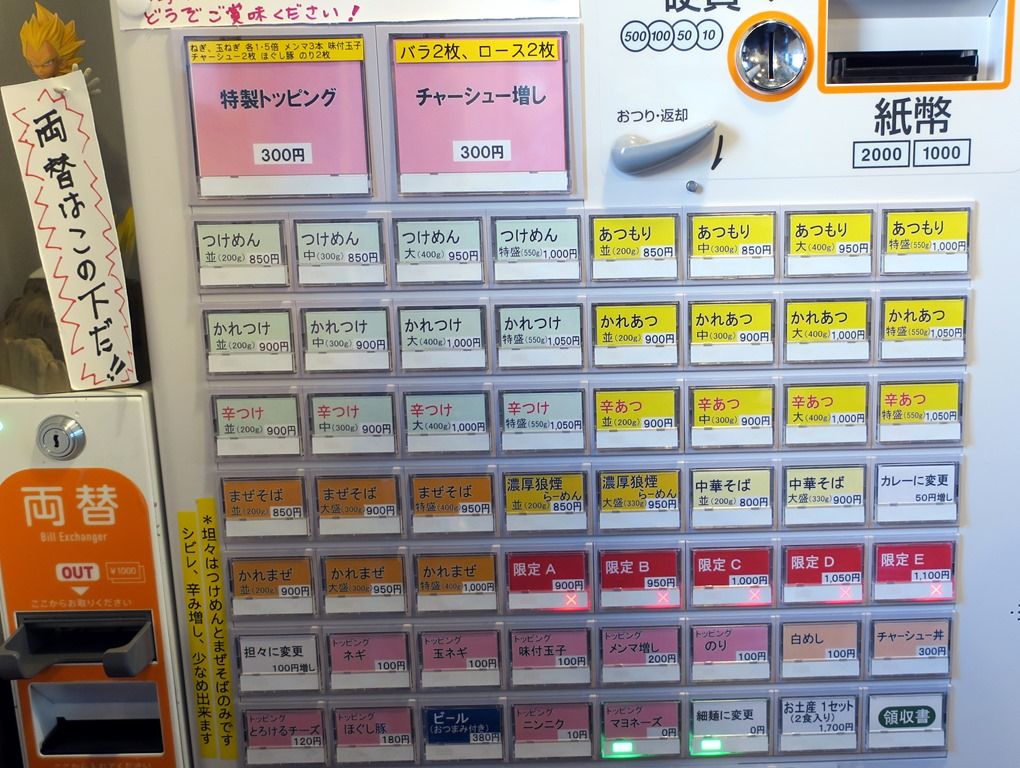 入店すると、まず券売機で食券購入です。主なメニューは、つけめん850円、かれつけ900円、辛つけ900円、まぜそば850円、かれまぜ900円、担々に変更100円、濃厚狼煙らーめん850円、中華そば800円、他。