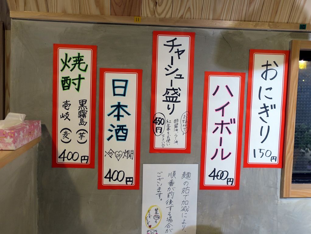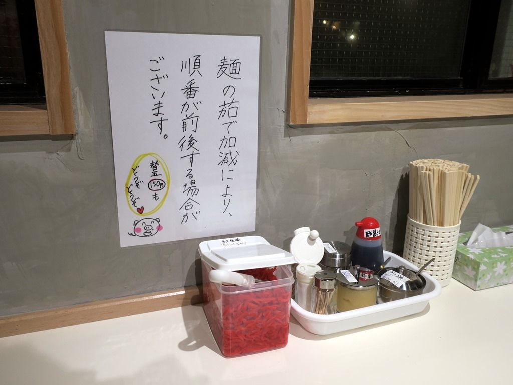 BGMは地下広場で開催中のショーの昭和歌謡。箸は割り箸。卓上調味料・薬味は、紅生姜、塩、すりごま、おろしにんにく、胡椒、ラー油、酢醤油。替え玉を注文すると、カエシが提供されます。