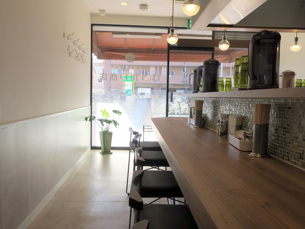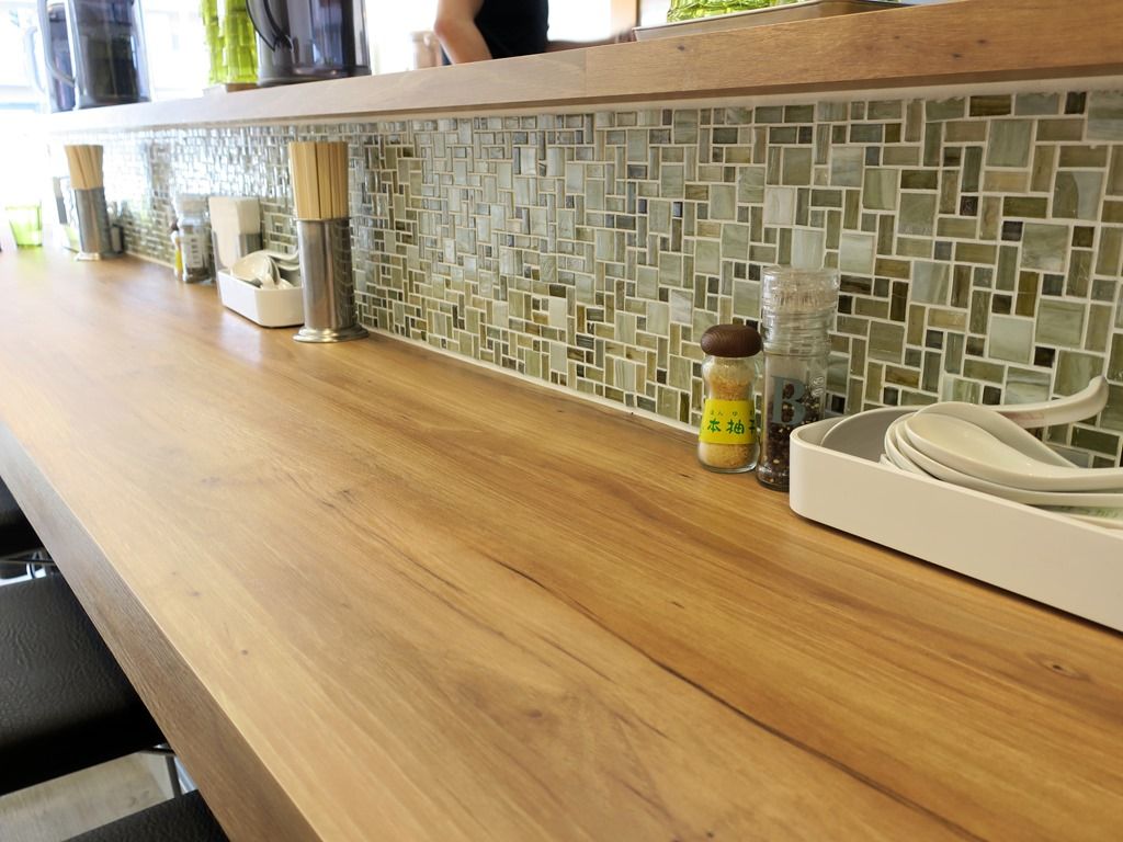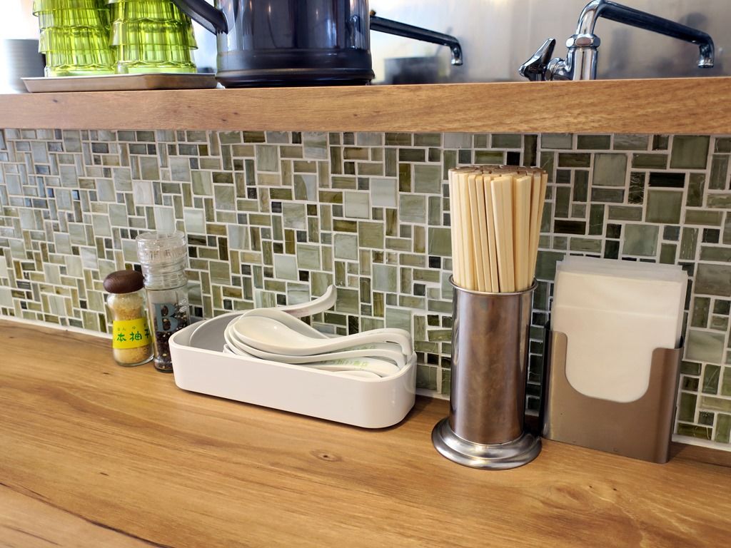 BGMはポップス。箸は割り箸。卓上調味料は柚子パウダー、粒黒胡椒。