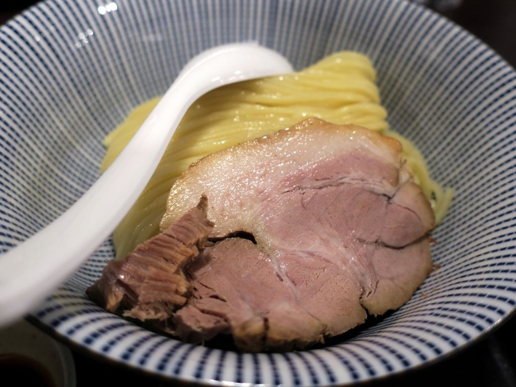 麺皿の具はチャーシュー。麺はストレート中太タイプ。つけ麺としては細身ので細つけ麺と言っても通りそう。