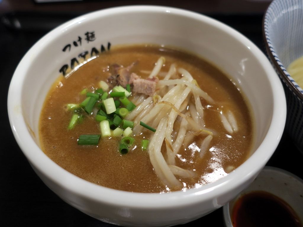 つけ汁はどろっと濃厚な豚骨味噌味。つけ汁の中の具はモヤシ、ほぐしチャーシュー、メンマ、きざみ青ねぎ。