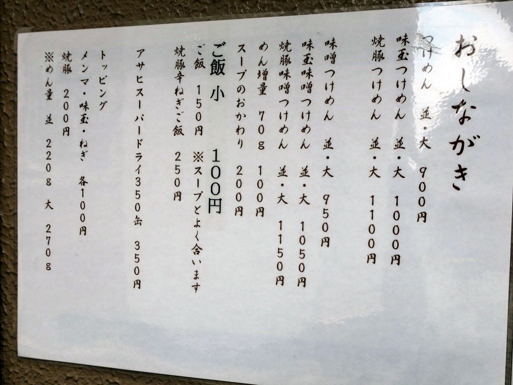 主なメニューは、つけめん900円、味噌つけめん950円、ごはん150円、ご飯小100円(本日発売の新商品)、他。麺量並盛220g、大盛270g、大盛同料金。