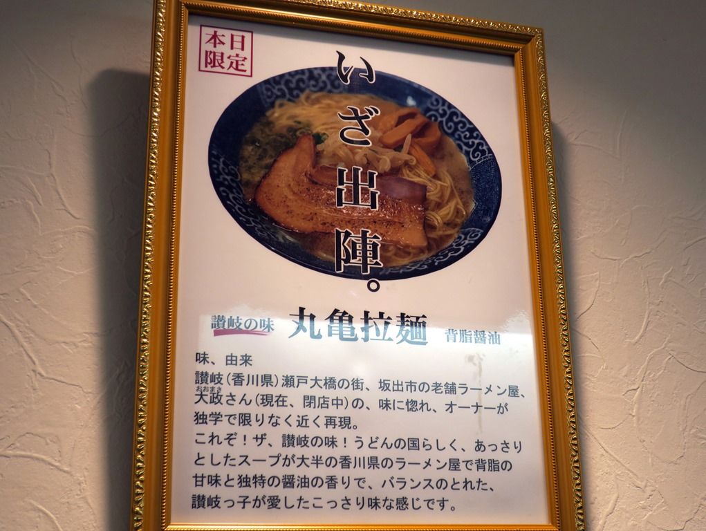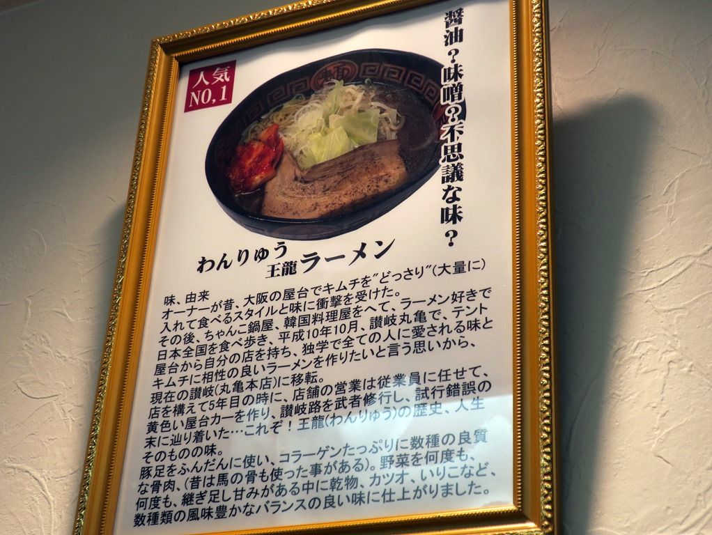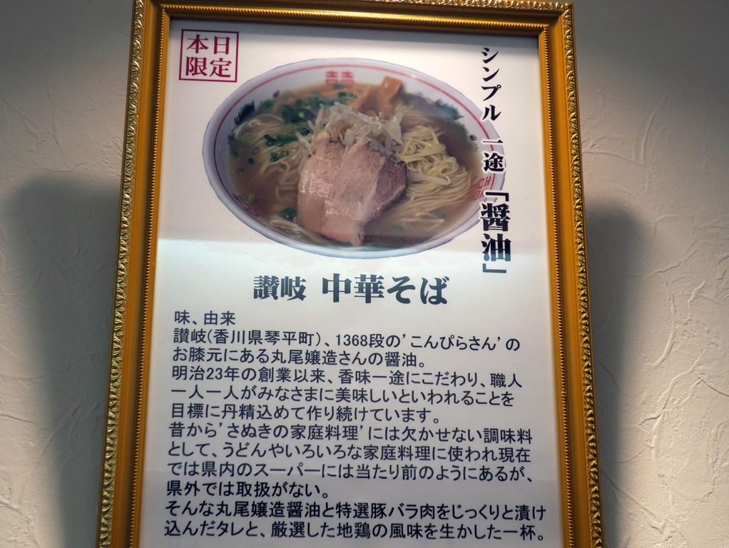 昼の麺メニューは、讃岐中華そば750円、丸亀拉麺800円、讃岐ぶっかけ冷やしラーメン850円、王龍ラーメン850円。
