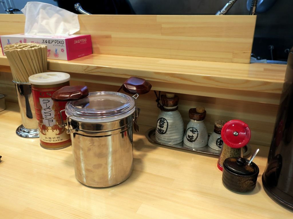 卓上調味料・薬味は、GSラーメンコショー、自家製ネギ白菜キムチ、醤油、七味、すりごま、おろしニンニク。そして待つことしばし、「讃岐中華そば」完成で〜す♪