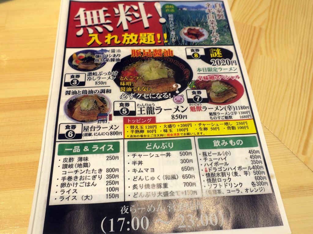 夜の麺メニューは、讃岐ぶっかけ冷やしラーメン850円、王龍ラーメン850円、屋台ラーメン800円、魁獣ラーメン(辛)1180円。