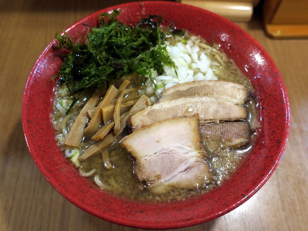 具は分厚いカットのチャーシュー、岩海苔、きざみ玉ねぎ、きざみねぎ。ポスターではチビ煮干しが何尾かトッピングされてますが、載せ忘れ?