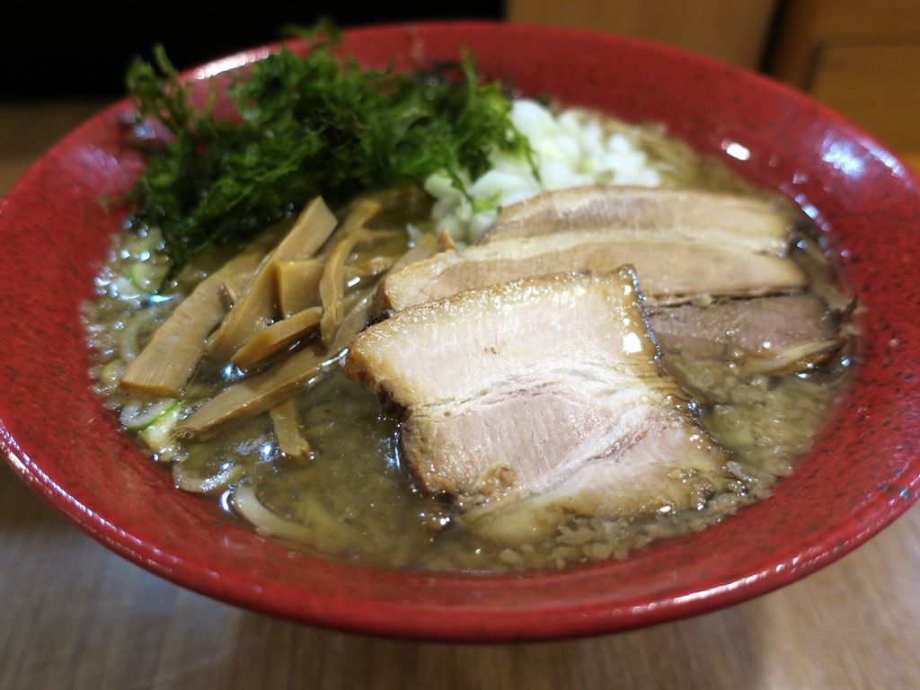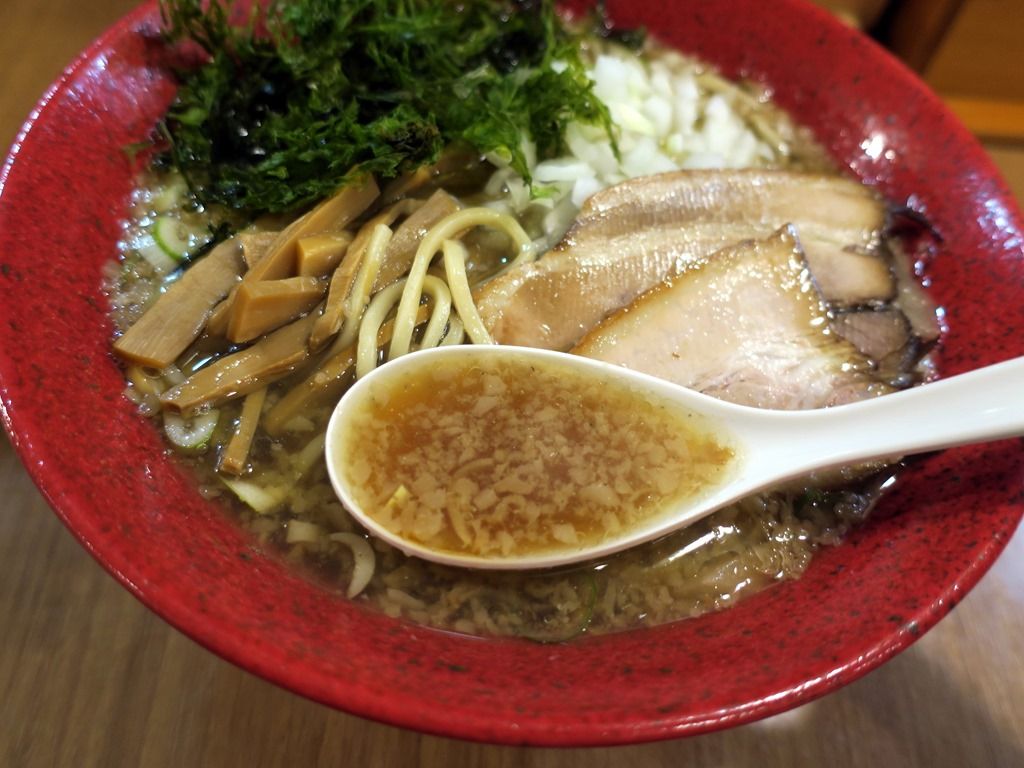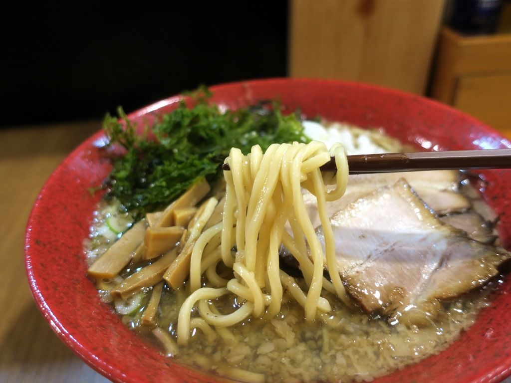 スープは、銀鱗が浮かぶ灰濁の煮干し出汁。そこにたっぷりの背脂。青森発ですが燕三条系的な構成。煮干しの風味はまずまず。出汁とカエシで塩分やや強め。具もどっさりで麺量も多めでコスパは高し。安定感のある定番の味わいで美味しい!ただ、欲を言えば味的には何かもう一つ吹っ切れた感じが欲しいかも。