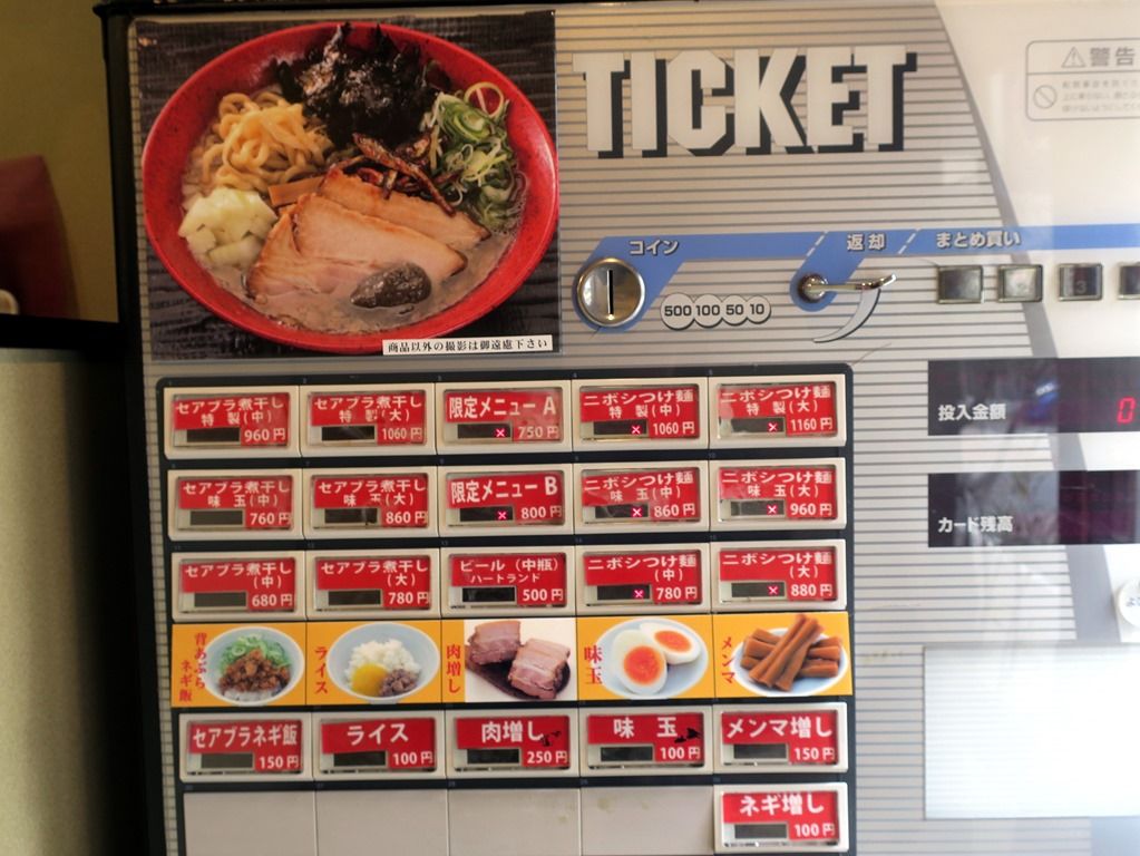 入店すると、まず券売機で食券購入です。券売機とカウンターには店内商品以外撮影禁止と掲示かありますが、今回券売機とカスターは特別に撮影許可を得ました。主なメニューは、セアブラ煮干し(中)680円、ニボシつけ麺(中)780円、セアブラネギ飯150円、他。訪問時つけ麺は準備中。