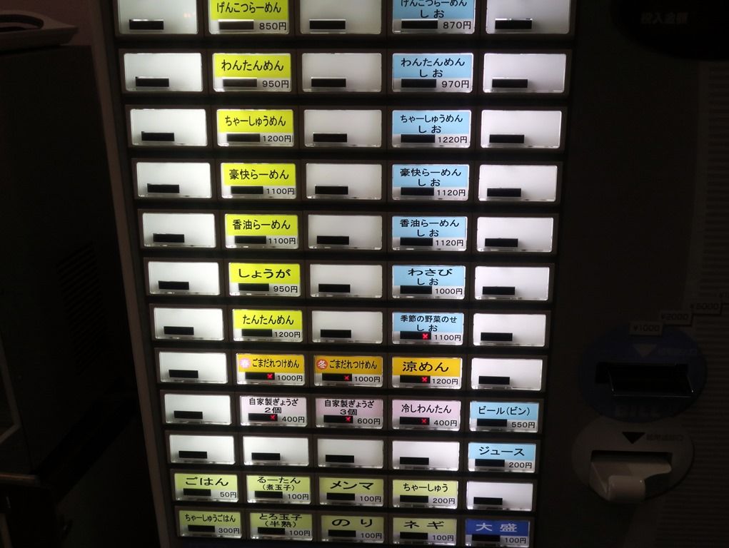 入店するとまず券売機で食券購入です。主なメニューは、げんこつらーめん850円、げんこつらーめんしお870円、豪快らーめん1100円、豪快らーめんしお1120円、香油らーめん1100円、香油らーめんしお1120円、たんたんめん1200円、ごまだれつめん春・冬1000円、涼めん1200円、他。ぎょうざ・わんたん・つけめんは本日準備中。