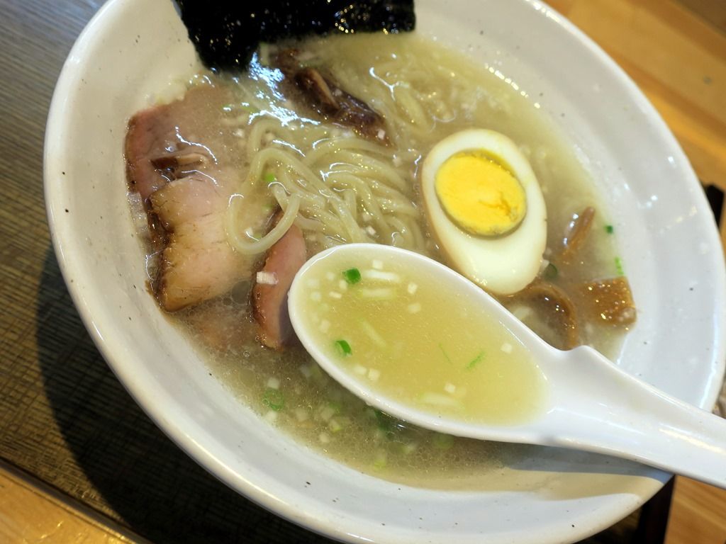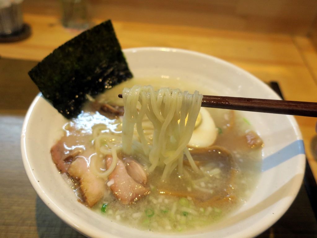 スープはさらさらの清湯塩味。以前から変わってないとすると、マグロ節ベースの和風出汁と、豚骨・鶏ガラの動物性の白湯スープのWスープ。塩にしたせいかもですが、えっ!?こんなに旨かったっけ?っくらいいい味わい。スープ1杯分まるごとおかわりしたいほどすごく美味しい!