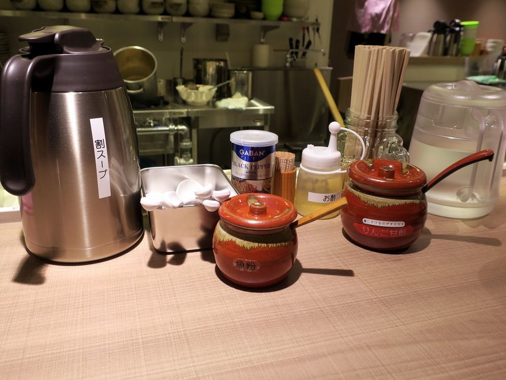 厨房には店主さんワンオペ体制。BGMはラジオ。箸は割り箸。卓上調味料は、GABANブラックペッパー、魚粉、酢、りんご酢。
