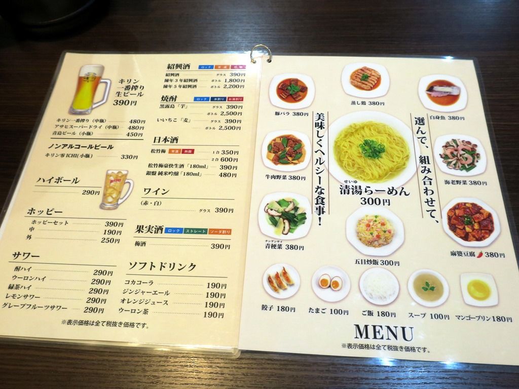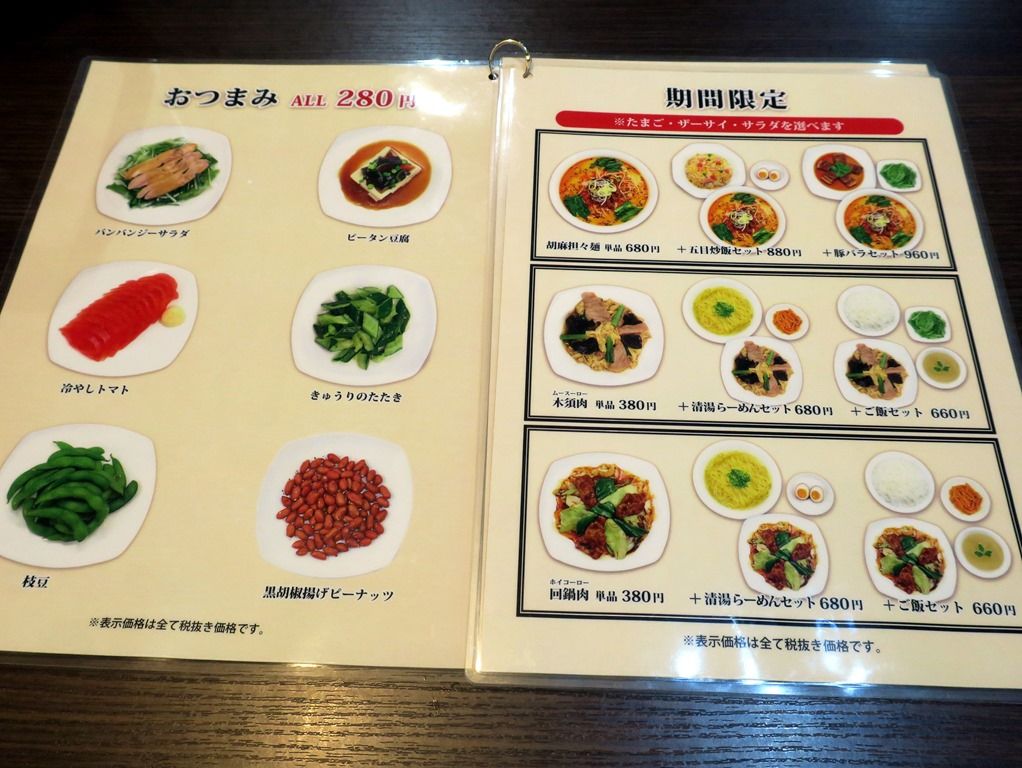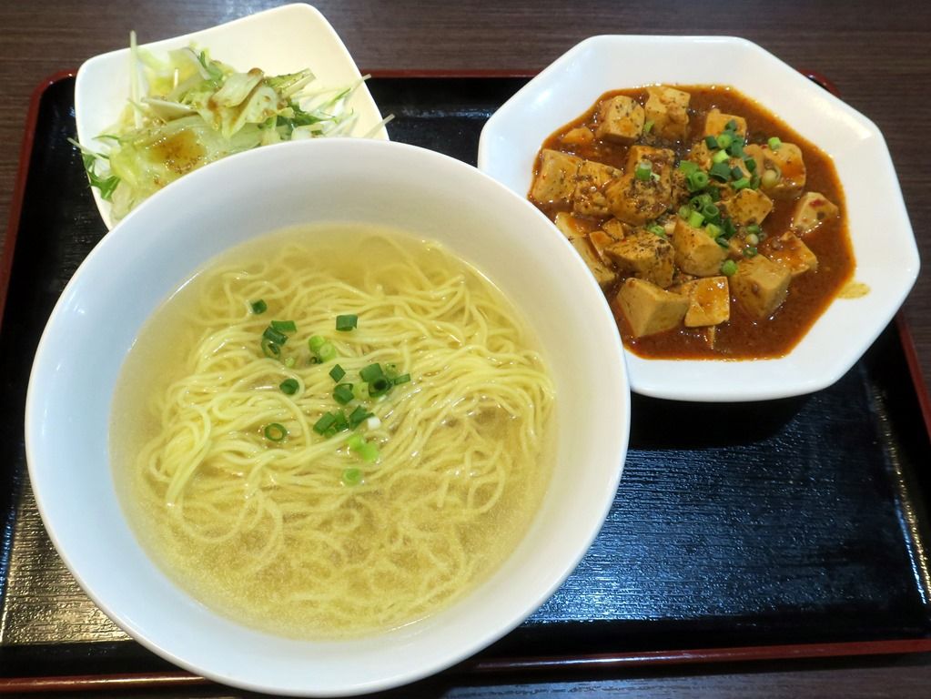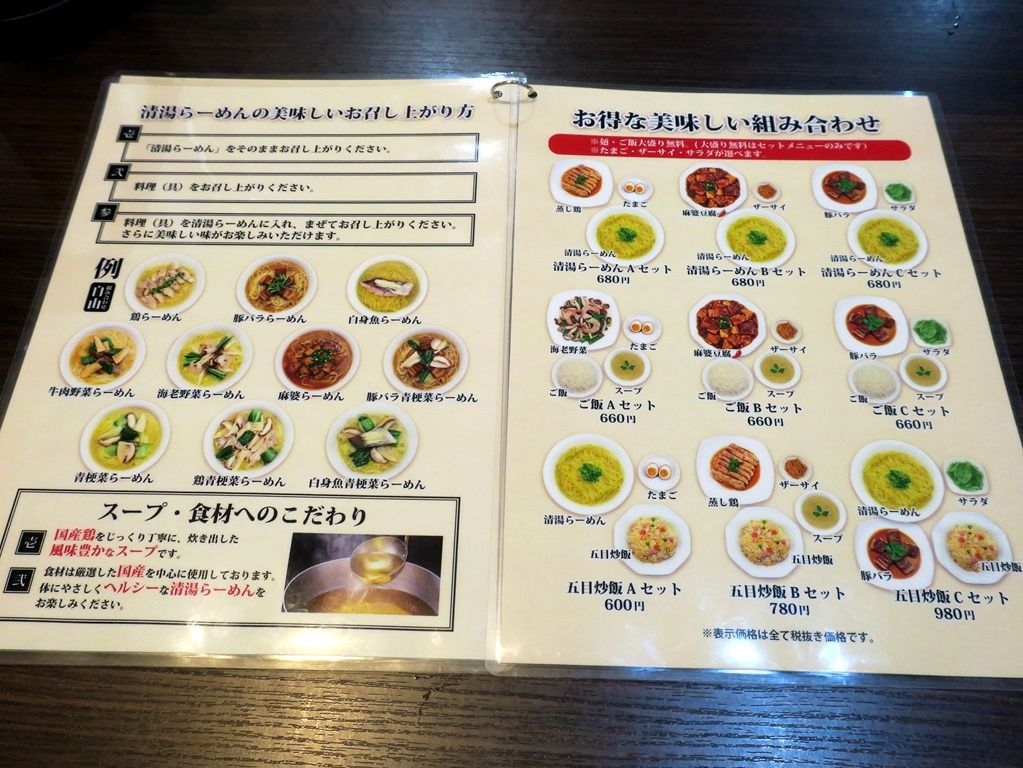 基本のラーメンは具なしの清湯らーめん300円、清湯らーめんセット Aセット蒸し鶏、Bセット麻婆豆腐、Cセット豚バラ 各680円。セットの副菜はザーサイ、味玉、サラダから選択。他に一品料理、ごはんセット多数。