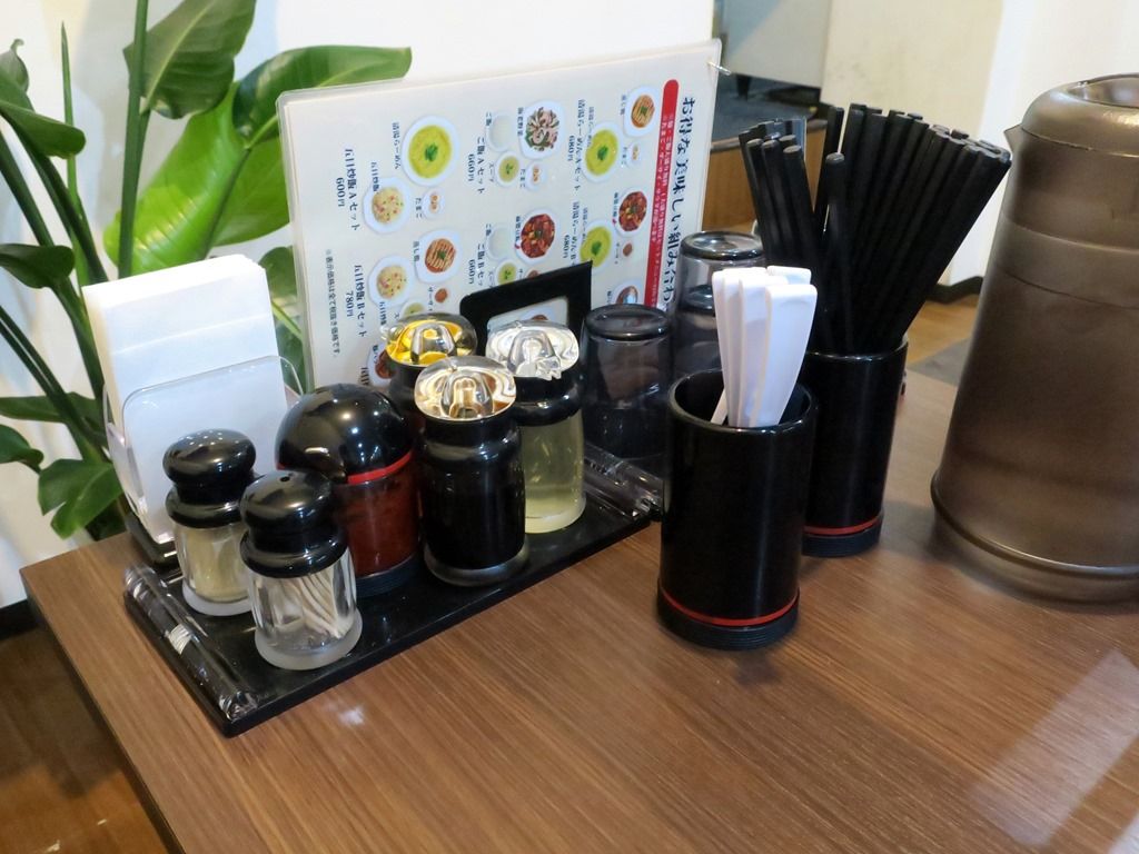 BGMはJ-POP、back numberとかAIとか。箸は洗い箸でエコ仕様。卓上調味料は醤油、ラー油、酢、胡椒、豆板醤。