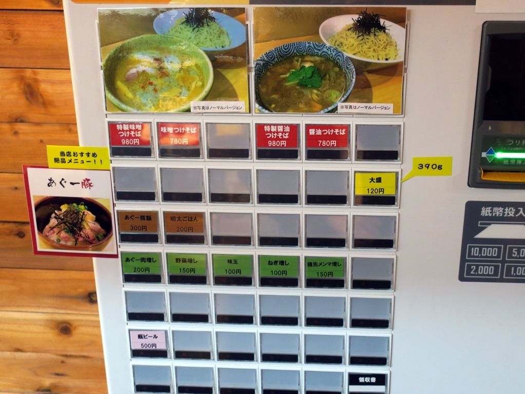入店すると、まず券売機で食券購入です。主なメニューは、味噌つけそば780円、醤油つけそば780円、他。