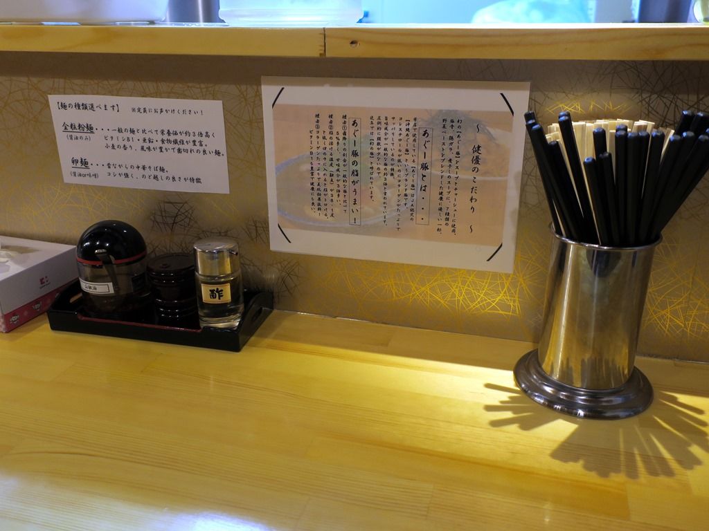 BGMはJ-POP。箸は割り箸と洗い箸のW装備。卓上調味料は一味唐辛子、山椒油、酢。