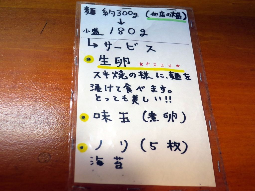 小盛りの場合は、生卵・味玉・海苔5枚のいずれかサービス。