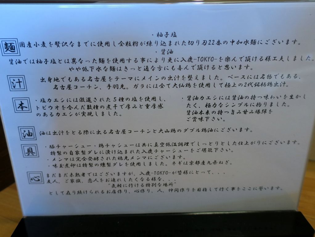 卓上メニュー立て、メニューの裏にはこだわりの蘊蓄。塩と醤油の麺は本来違うそうですが、本日醤油の麺は間に合わなかったそうです。