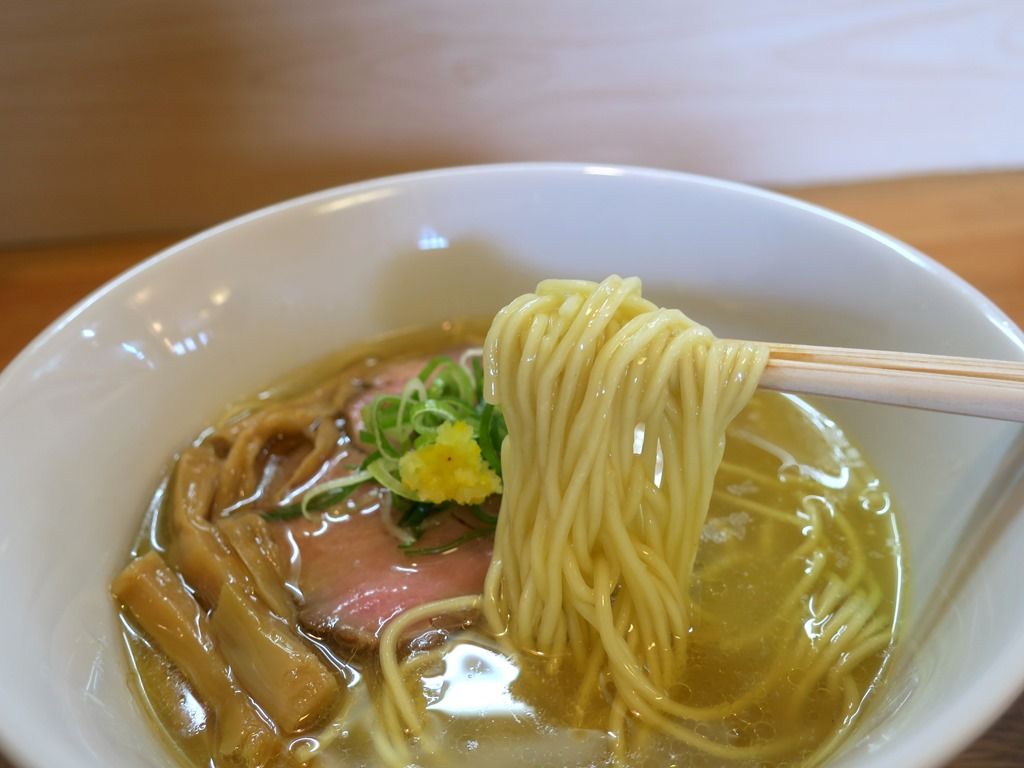 スープはさらさらの清湯塩味。店主出身地の名古屋をテーマに、名古屋コーチンの丸鶏、手羽先、大仙鶏(大山鶏?)のガラ等を使用。柚子塩って事で出身店のAFURI似かと思いきや、鶏出汁が分厚くて、清湯なのにエキスはド濃厚。コーチンと大山鶏の鶏油も強烈に香ばしく、原価が心配になるほど。潤沢な食材によるリッチな味わいですごく美味しい!
