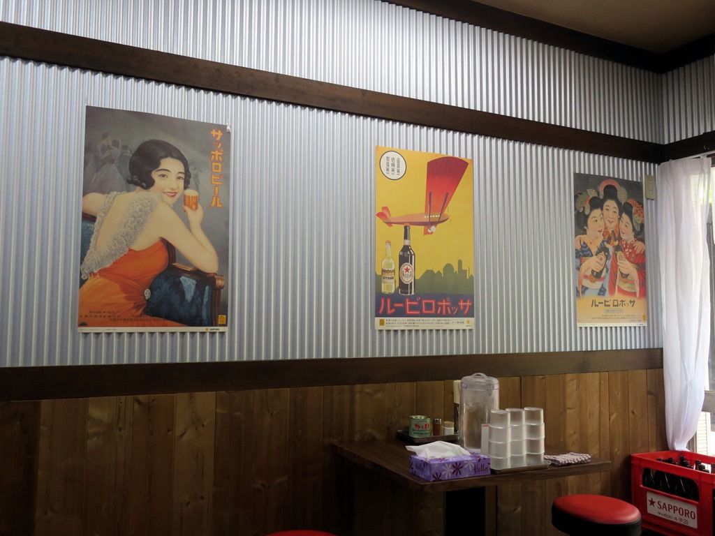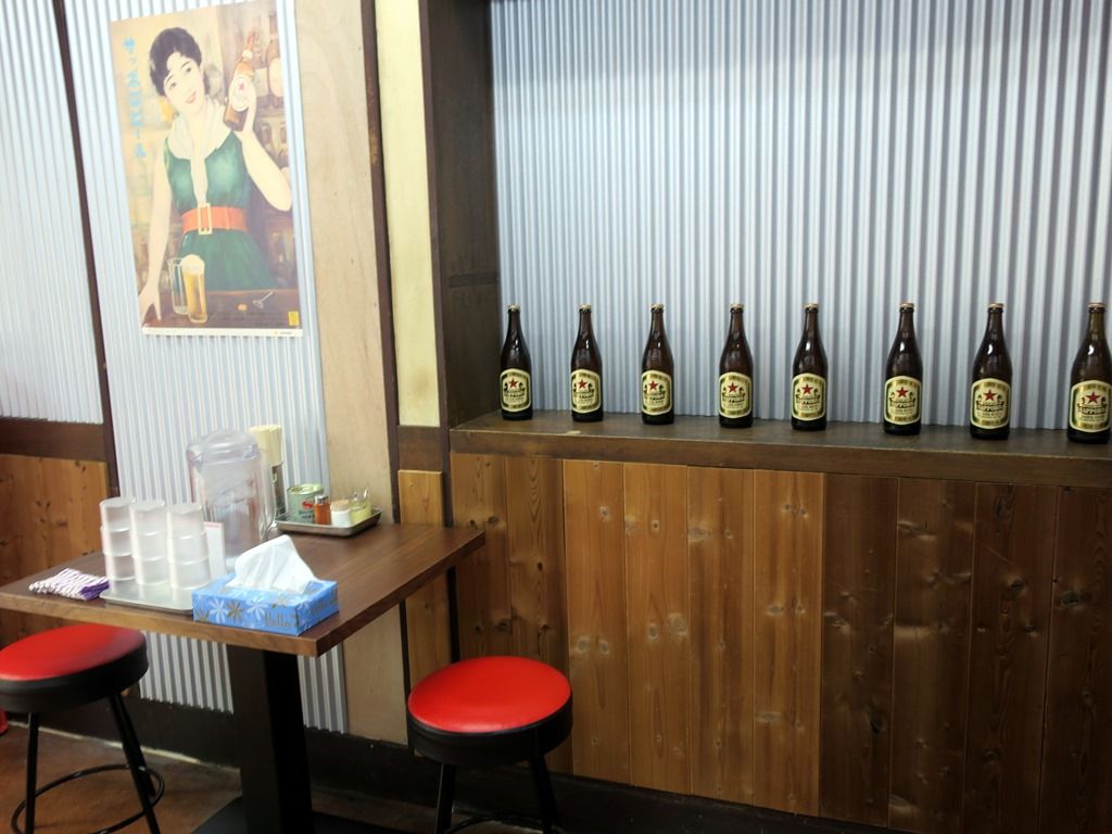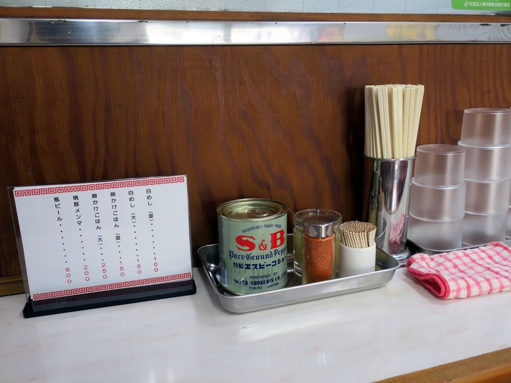 BGMはテレビ?ラジオ?放送。箸は割り箸。卓上調味料はS&Bコショー、一味唐辛子、おろしにんにく。