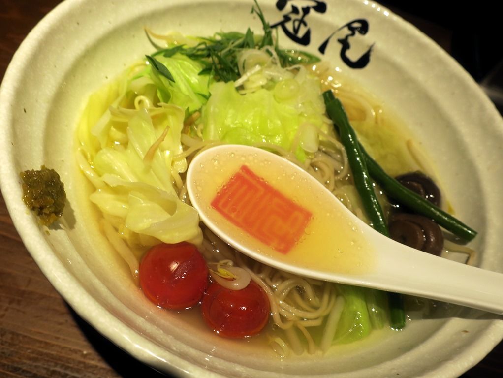 「野菜清湯半らぉめん」は「鷄清湯らぁめん」ベース。メニュー説明によると、麺半分で野菜多め、夜食に食べても罪悪感のない、ギルトフリーな嬉しいらぁめんとのこと。FBで御大が上げてたのを思い出して。外して撮ることが多いレンゲですが、SNS映えを意識したかの様なアートなディスプレイに思わずパチリ。
