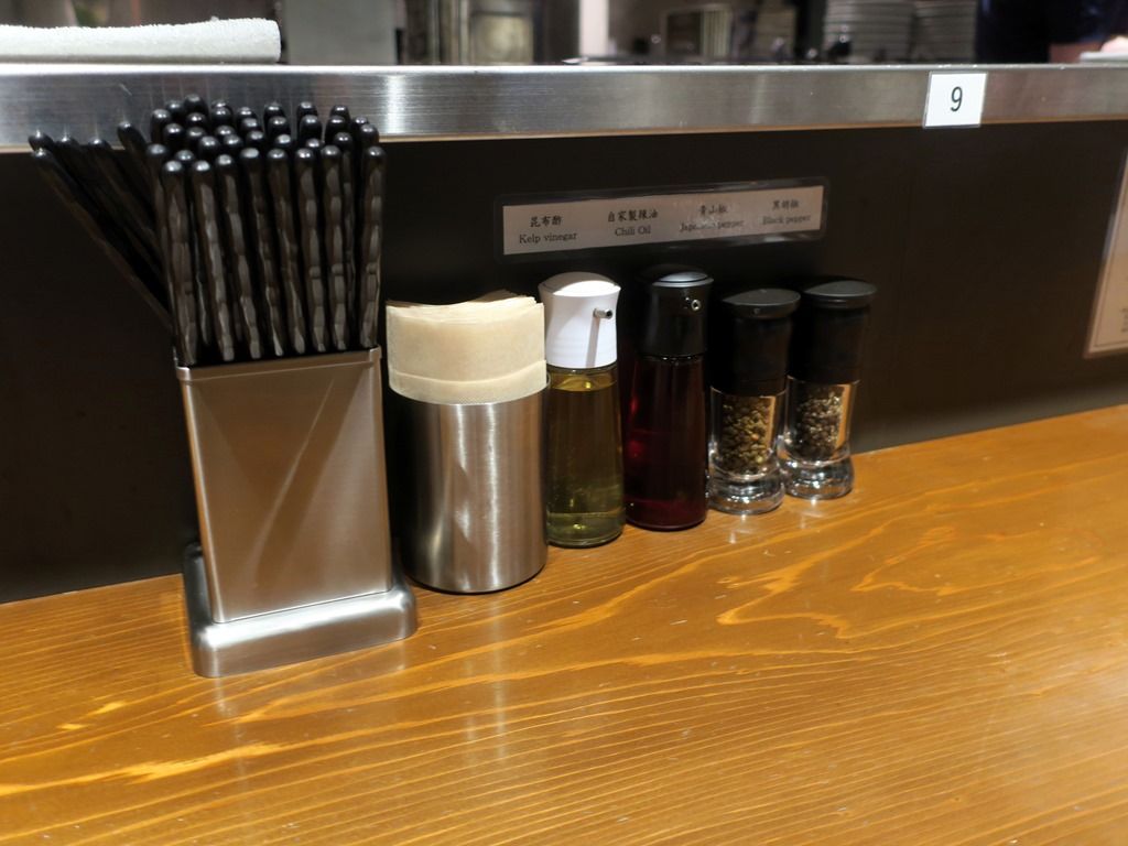 BGMはポップス。箸は洗い箸でエコ仕様。卓上調味料は昆布酢、自家製辣油、青山椒、黒胡椒。