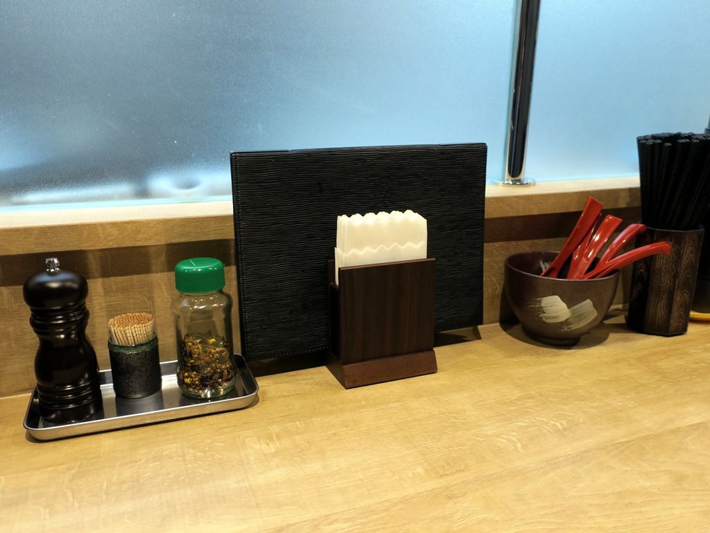 BGMはジャズ。箸は洗い箸でエコ仕様。卓上調味料はペッパーミル入り胡椒、のりたま。