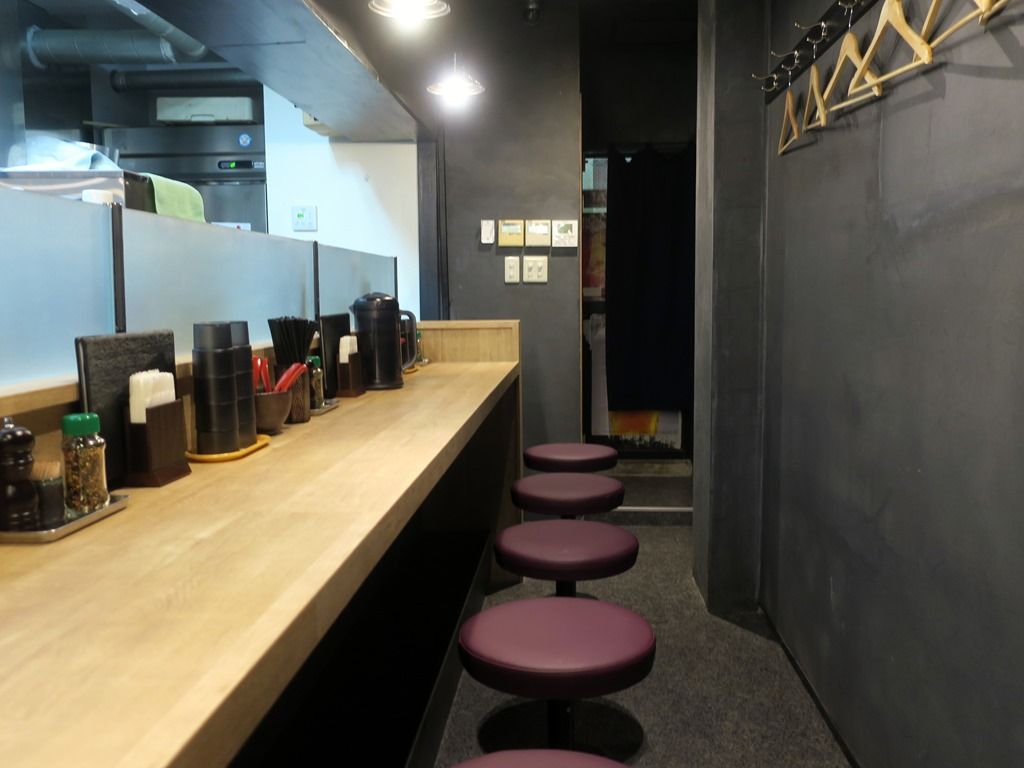 店内は厨房前に真っ直ぐなカウンター13席(4席・間・9席)、出入口そばに2人卓x2。