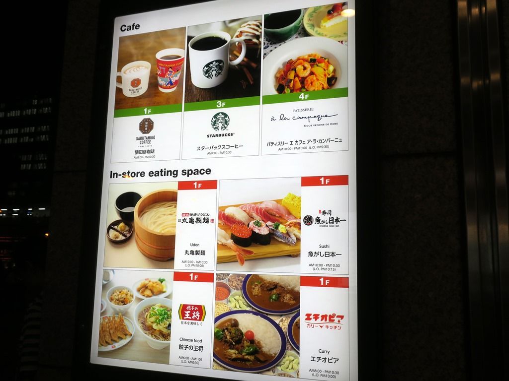 猿田彦珈琲、エチオピア カリーキッチン、丸亀製麺、東京ミルクチーズ工場「Cow Cow Kitchen」、(和菓子)日本橋屋長兵衛、(パン)ドンクエディテ、寿司 魚がし日本一、