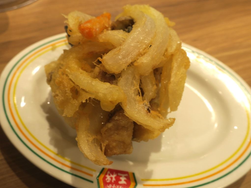 かき揚げは、玉ねぎ・にんじん・しいたけ・きくらげ、メンマ。かき揚げの高さは約10センチとボリューム満点。サクサク感が楽しめるようにと別皿提供ですが、揚げたてでも熱々でもなく揚げ置き。それでもやはりサックサクで美味しい!揚げ物用塩はありますが、出来れば天つゆ、無理なら醤油があるといいかも。