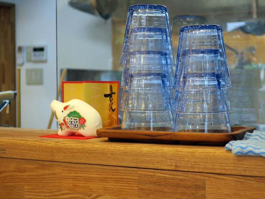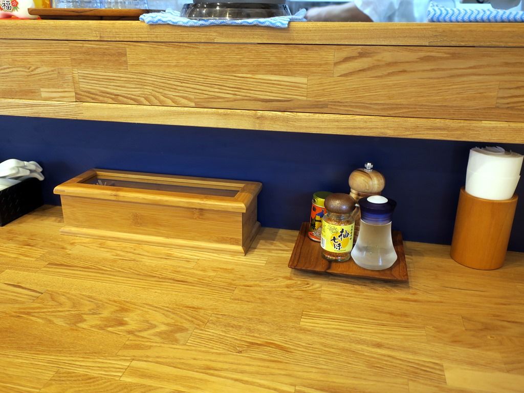 箸は洗い箸でエコ仕様。卓上調味料は一味唐辛子、柚子七味、酢、ミル入り胡椒。