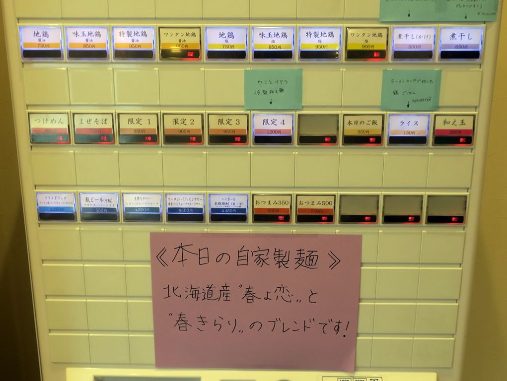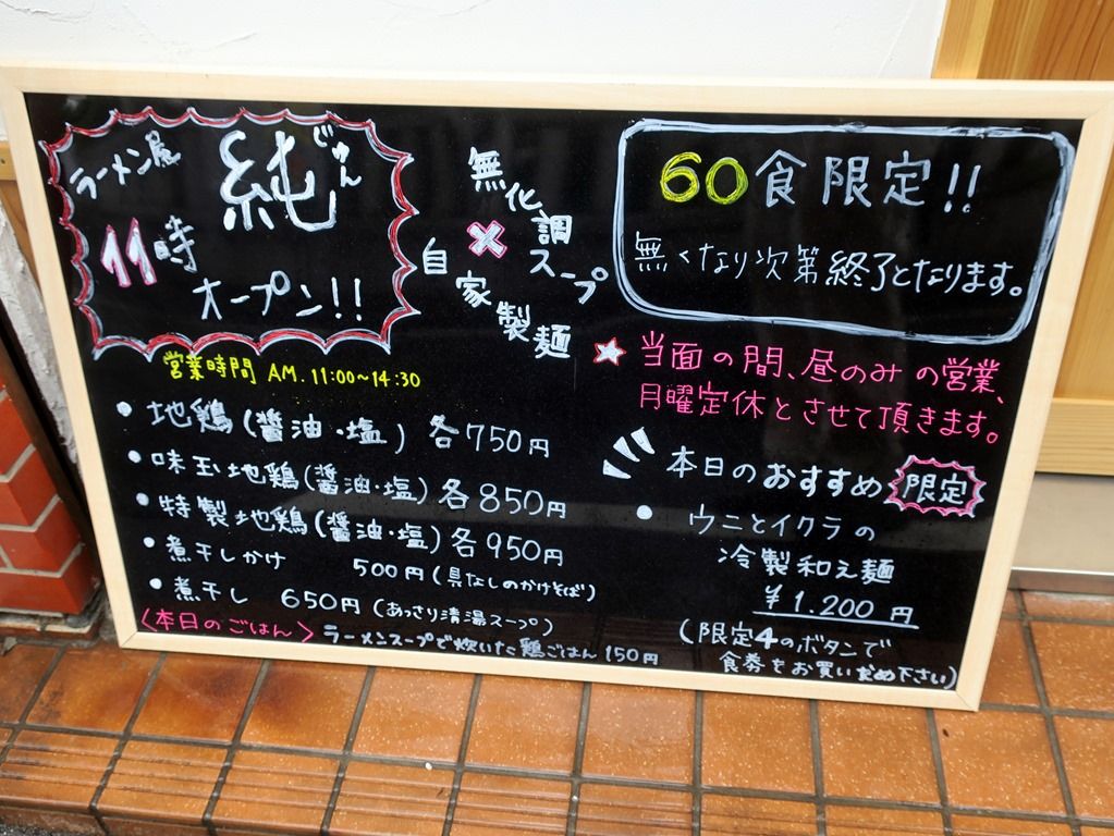 主なメニューは地鶏醤油750円、地鶏塩750円、煮干し650円、他。「本日のおすすめ限定」はウニとイクラの冷製和え麺1200円。ちなみに1日60食限定で、当面の間は昼営業のみ。