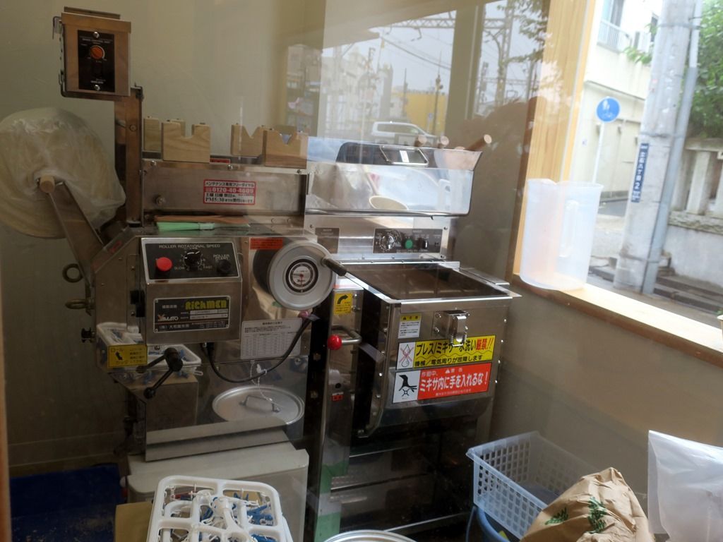 店外と店内カウンター端から見えるガラス張りの製麺室の中に、大和製作所製の製麺機。ですが、店主さんは大和ラーメン学校出身ではなく食の道場出身。