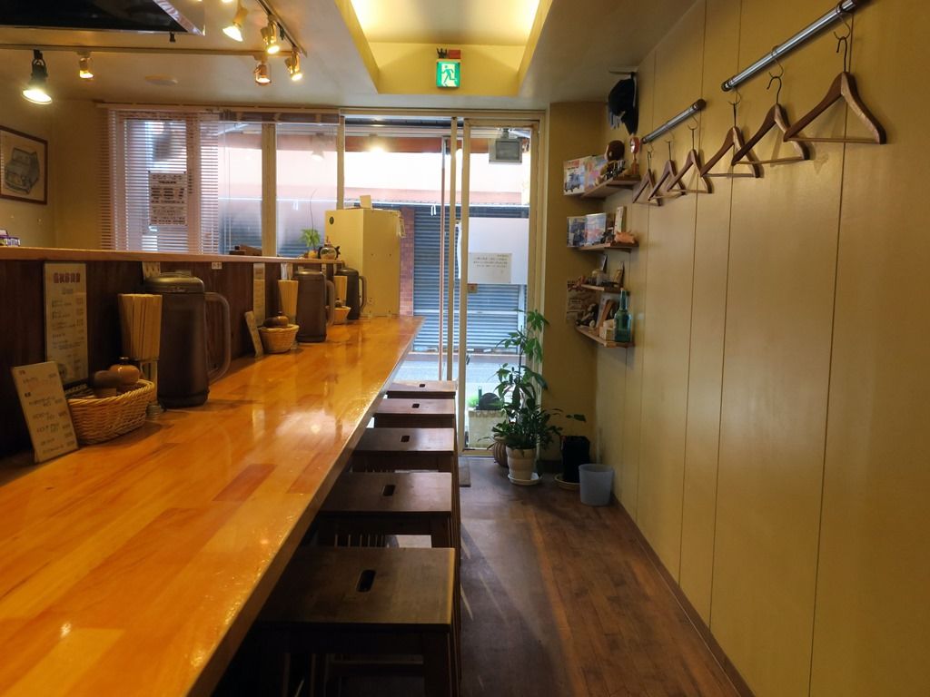 BGMはポップス。箸は割り箸。卓上調味料は一味唐辛子、ペッパーミル入り胡椒。