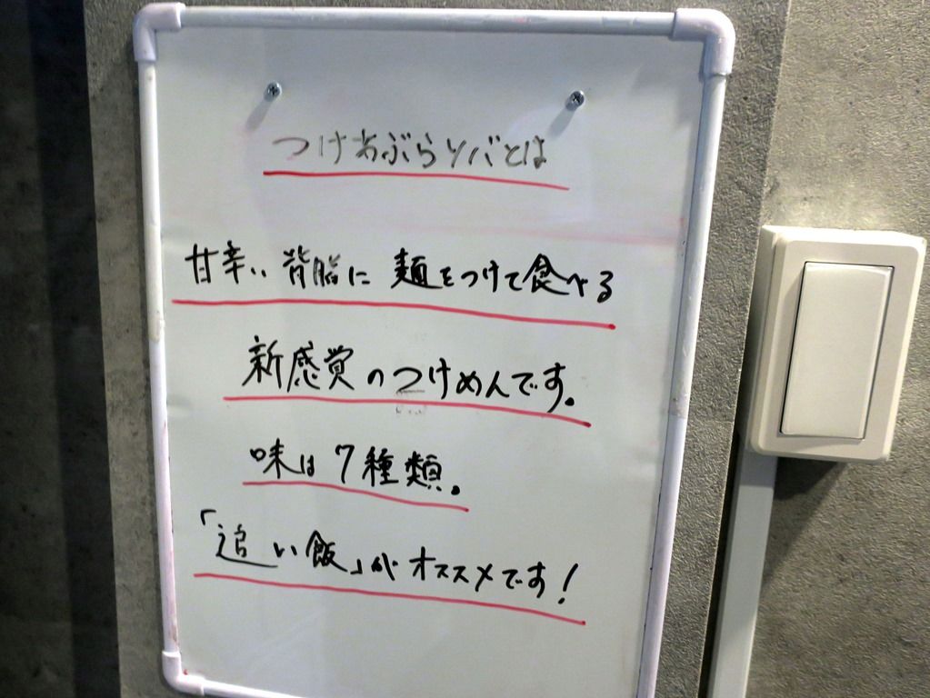 主なメニューは、つけあぶらソバ・つけあぶらソバ(辛)・つけあぶらソバ(ニンニク)・つけあぶらソバ(ショウガ)・つけあぶらソバ(チーズ)・つけあぶらソバ(痺)・つけあぶらソバ(カレー)各900円、追い飯100円、他。
