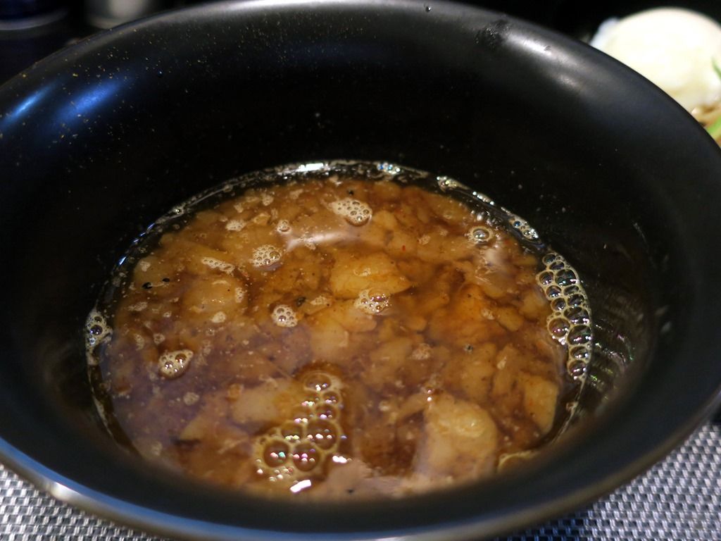 出汁アブラ(つけ汁)は、豚出汁、香味野菜、魚介類由来のスープに鬼脂レベルの大量の背脂。
