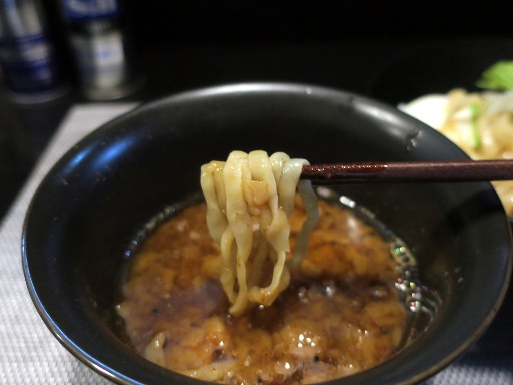 「辛」と「カレー」と迷って「カレー」に。先に麺、少しして出汁アブラ(つけ汁)の順に、つけ麺のセオリー通りの提供順で着丼。
