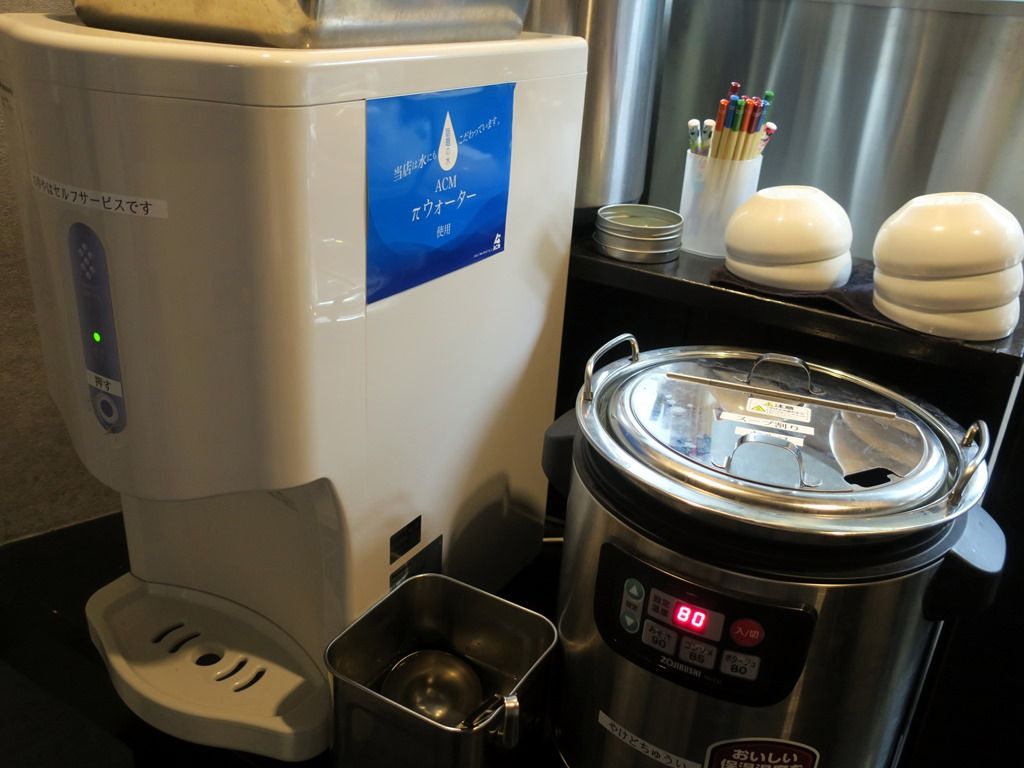 券売機横にπウォーターが入った給水器と、割りスープ用のスープジャー。