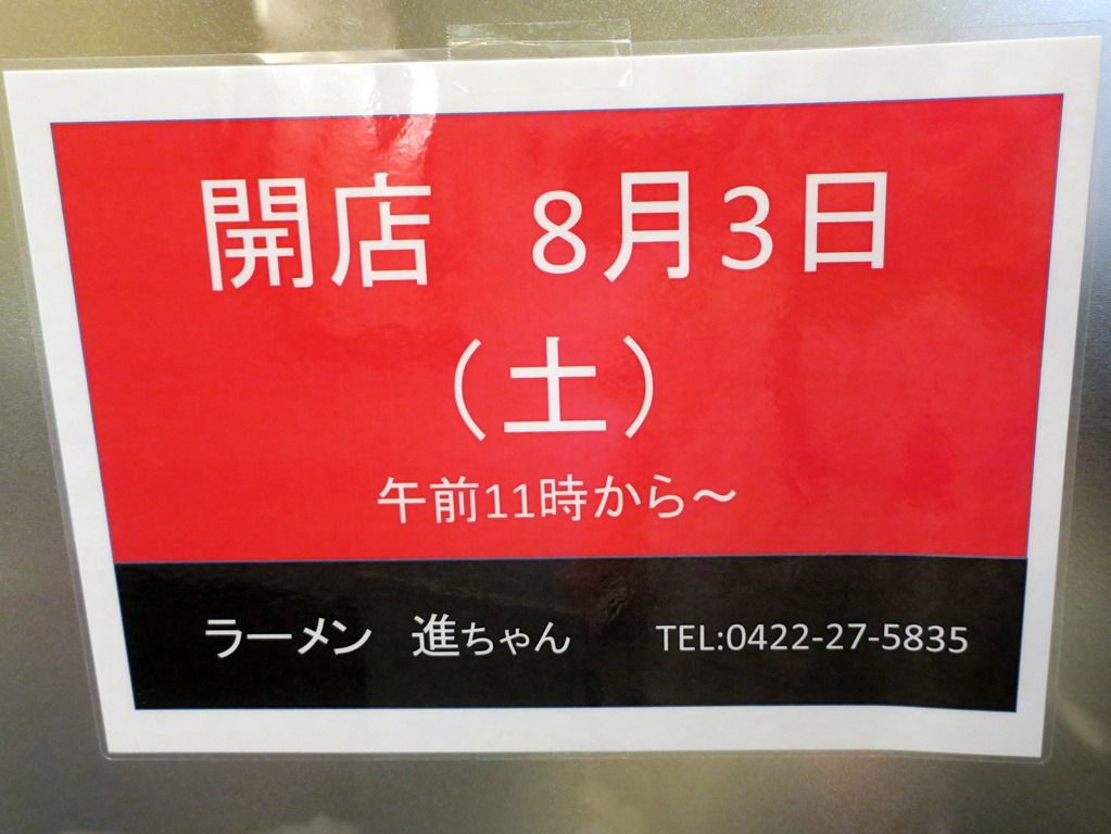 2019年8月3日、本日オープンの新店「ラーメン 進ちゃん」へ、。